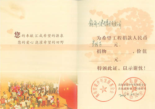 海川集團多年來一直把履行社會義務,回饋社會,報效祖國作為企業(yè)的重要職責,在企業(yè)發(fā)展的同時,不忘社會公益事業(yè),十幾年來已向社會公益事業(yè)捐款累計超過460萬元:先后向青島市教師素質(zhì)專項基金捐款30萬元,捐建貴州江口縣雙江鎮(zhèn)希望中學30萬元,捐建膠南市黃山鎮(zhèn)希望小學30萬元。并通過基金會捐助惜福鎮(zhèn)后金小學多臺電腦用于教學,2013年4月,又向惜福鎮(zhèn)“為了惜福孩子的明天”大型公益活動捐款30萬元。另外,在汶川地震期間,組織廣大職工開展賑災捐助活動,奉獻愛心,先后向市紅十字會捐款129690元,榮獲“紅十字博愛銀獎”。近年又為惜福鎮(zhèn)教育基金捐款300萬元。2014年至今,連續(xù)三次組織員工積極開展無償獻血公益活動,緩解了島城醫(yī)療機構(gòu)臨床用血的緊張局面,充分體現(xiàn)了海川集團及廣大員工的社會責任感和無私奉獻精神。