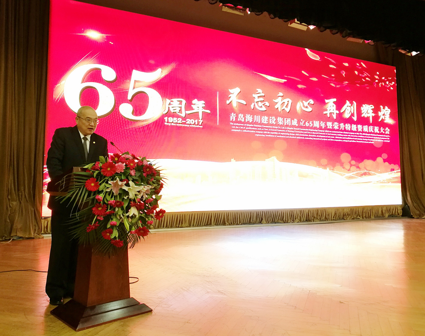2017年12月29日上午,青島海川建設(shè)集團(tuán)成立65周年暨榮升特級(jí)資質(zhì)慶祝大會(huì)在黃海飯店隆重舉行。蒞臨現(xiàn)場(chǎng)的嘉賓有:原二建公司經(jīng)理陳樹業(yè)、原二建公司經(jīng)理國常光、原二建公司經(jīng)理鄭同慶,青島建設(shè)集團(tuán)建興工程有限公司董事長(zhǎng)逄振輝、青建隆泰興業(yè)建設(shè)有限公司總經(jīng)理趙錫業(yè)、青島建設(shè)裝飾集團(tuán)有限公司董事長(zhǎng)張波等領(lǐng)導(dǎo)。海川建設(shè)集團(tuán)董事長(zhǎng)吳鑫、總裁仇建軍和公司股東、理事會(huì)成員、企業(yè)中層管理人員200余人參加,共同見證海川建設(shè)集團(tuán)在改革奮進(jìn)歷程當(dāng)中砥礪前行的輝煌成果。